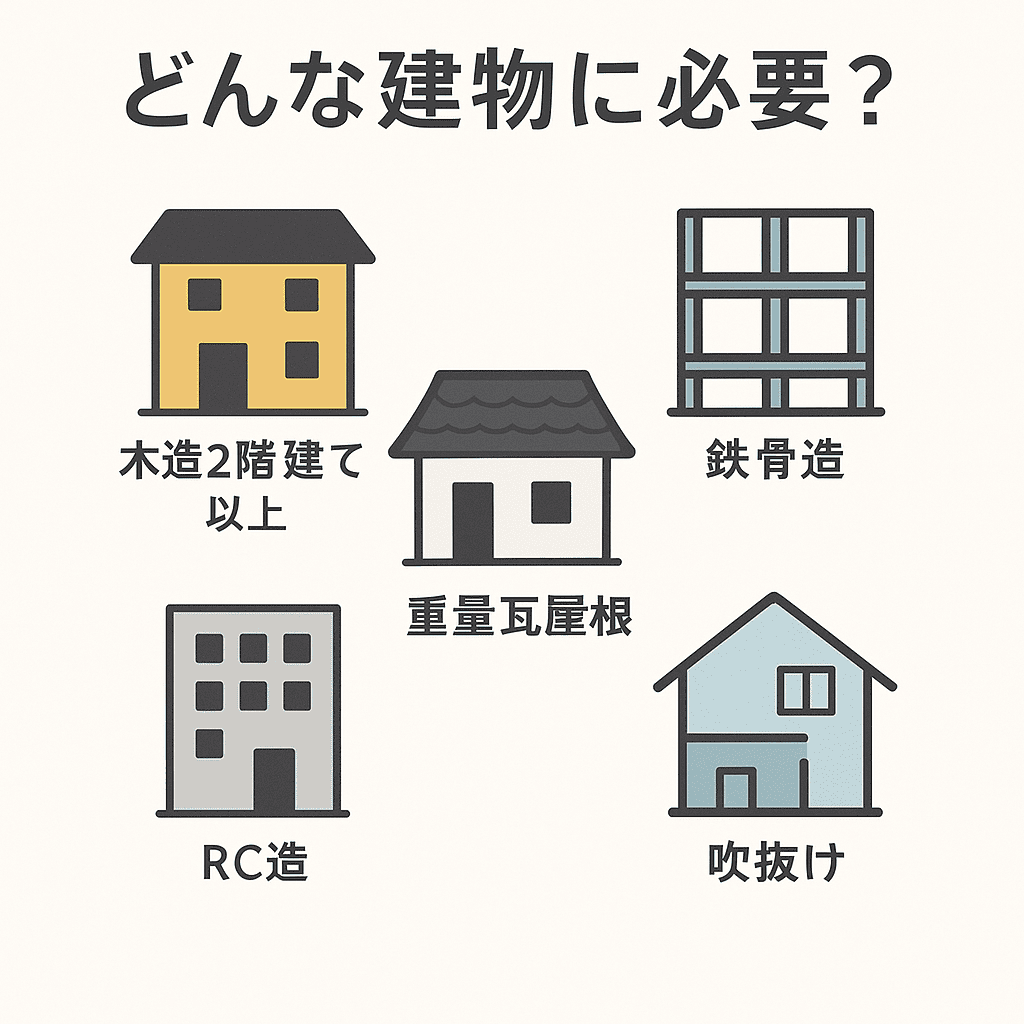 建物が 地震・風・積雪・自重 といった外力に耐えられるかを科学的に検証するプロセスで、木造3階建て以上の住宅や鉄骨造・鉄筋コンクリート造で必要となります。