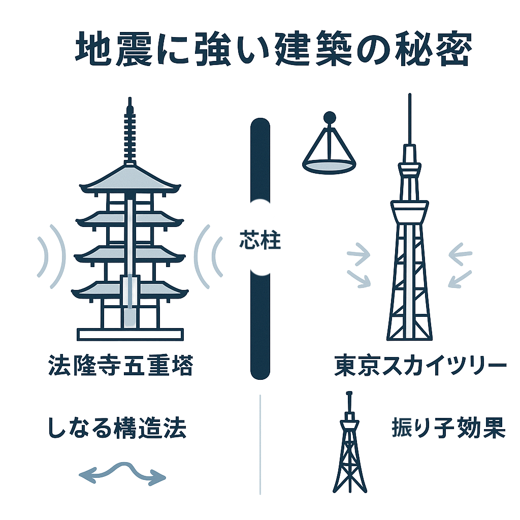 法隆寺の五重塔と東京スカイツリーには、どちらも中心の柱で揺れを抑える工法や、重心を下げて安定させる工夫が取り入れられています。